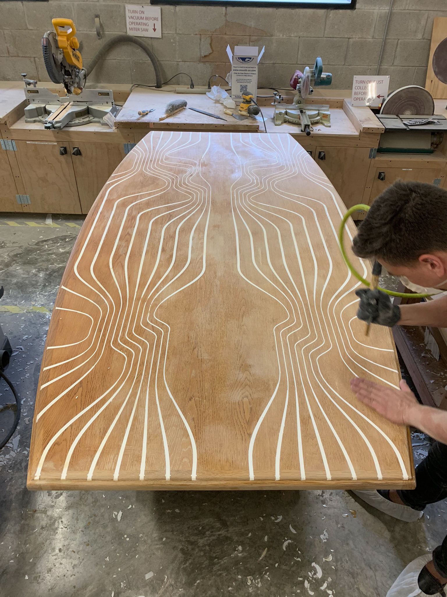 With the grooves complete, my colleague Elmer Garcia and I filled them with white resin, then sanded the entire surface to achieve the clean, refined finish showcased here. The result: a modern, reimagined piece that symbolizes innovation, resourcefulness, and the beauty of collaborative creation.